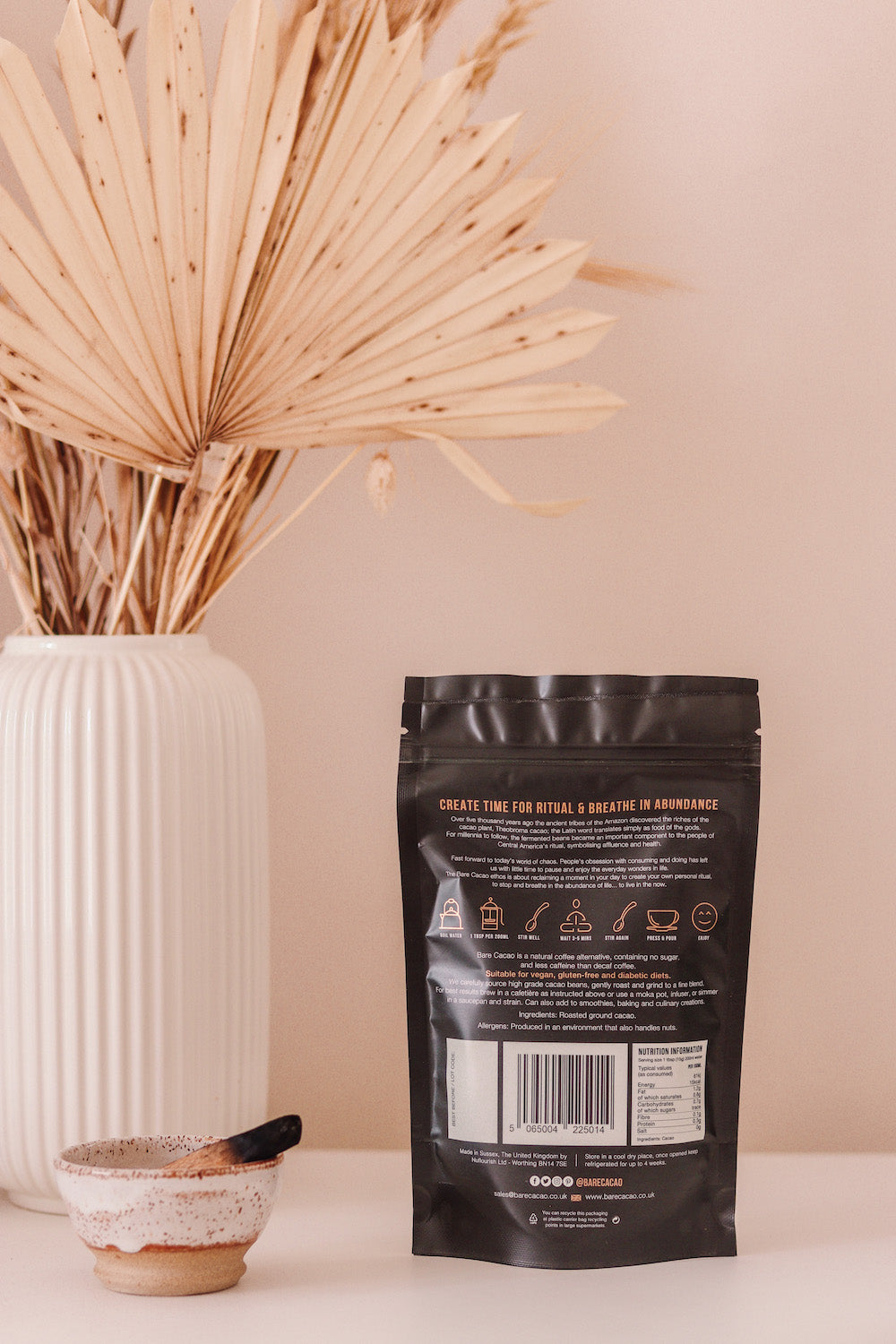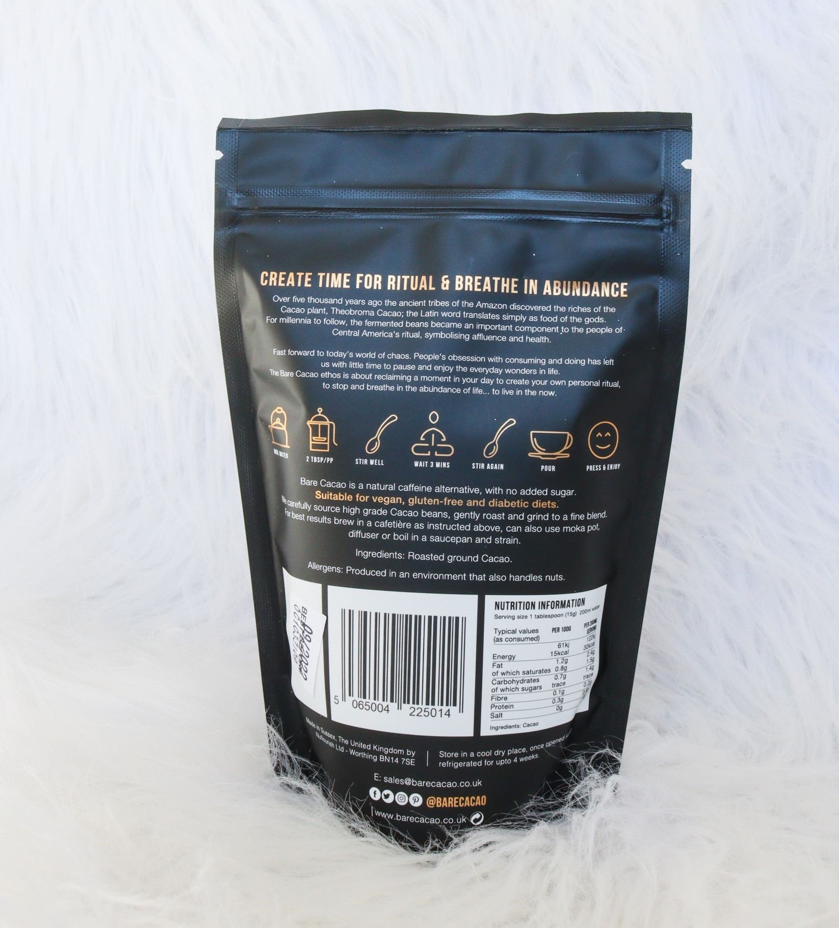 Made from 100% gently roasted organic cacao beans, packed full of antioxidants and essential minerals, such as potassium, magnesium, iron and zinc. Ground to a fine powder so its easily prepared just like fresh coffee in a cafetiere. Also great as an addition to smoothies, overnight oats cooking and baking.